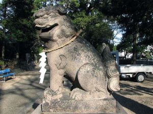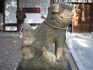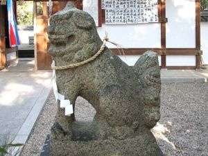 | 境内入口にいる天保14年(1843)生まれの浪速狛犬 こちらは阿吽ともに角付きで、どちらかというと「ニンマリ・ワハハ系」のにこやか狛犬です。素朴な体型をしています。 狛犬の拡大写真はこちらで |