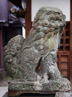阿は玉に前脚を乗せ、吽には子狛が縋り付いています。上品な顔立ちで毛の流れが綺麗な良い狛犬ですが、剥落が進んでいるのが残念です。