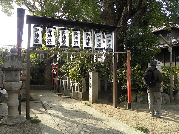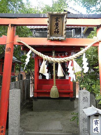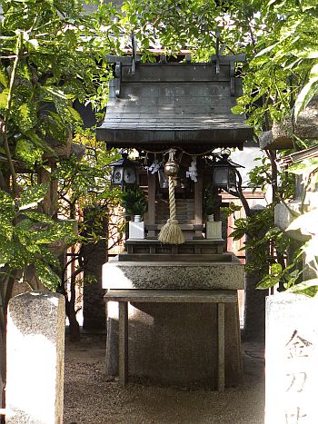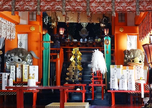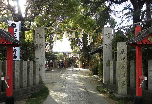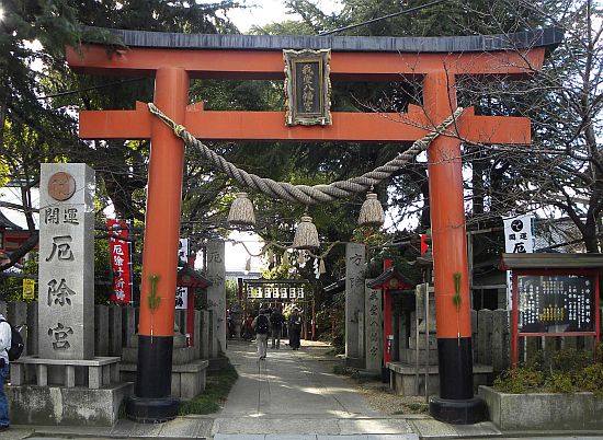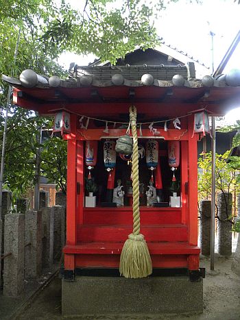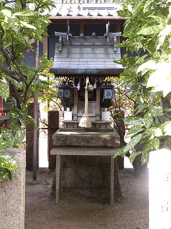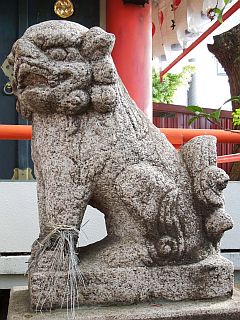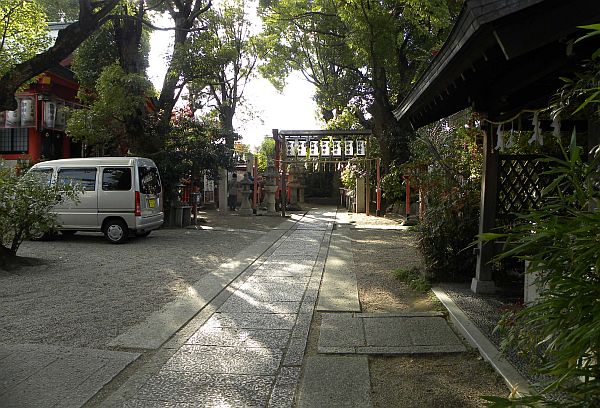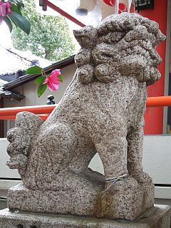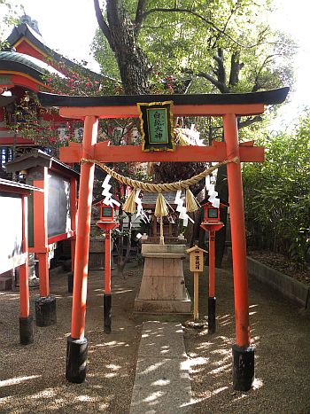 入口には朱の鳥居と「開運 厄除宮」の石標が立ち、参道途中に社号標と注連柱が立っています。境内入口には鳥居型の提灯掛けがあり、右には「百度石」、ここから参道は90度左に曲がり浪速狛犬が護る拝殿、塀内に本殿が建立されています。又、社殿右や境内奥には白髭神社等の境内社が祀られています。