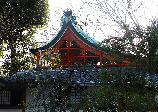 この神社は谷町線・谷町九丁目駅の西約200mに鎮座しています。道路沿いの参道入口から真北に向かって約100m程参道が続き、その間神橋や献梅碑、北野恒冨筆塚、梅ノ井等が点在しています。