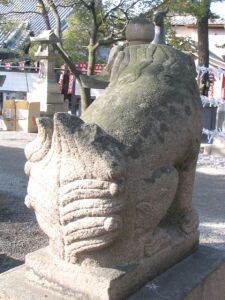 この神社は泉大津市から204号線で大津川を渡ると、さつき通り信号角に鎮座していますが、地図には記載されていません。道路沿いに、赤く目立つえびすさんの幟旗がはためいていたので、急遽車を寄せ参拝しましたが、戎神社かと思いきや、実は天神様でした。それにしても流石商業都市・大阪です。至る所に恵比須神社があるのには驚きました。