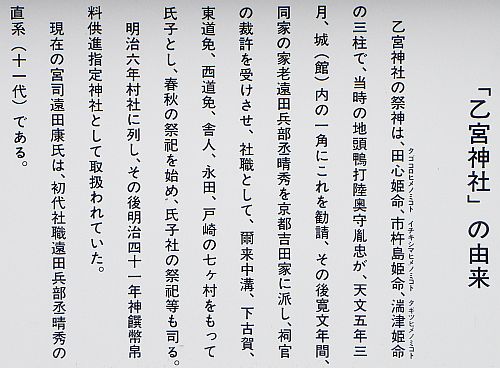 由緒:乙宮神社の祭神は、田心姫命、市杵島姫命、湍津姫命の三柱で、当時の地頭鴨打陸奥守胤忠が、天文5年3月、城(館)内の一角にこれを勧請、その後寛文年間、同家の家老遠田兵部丞晴秀を京都吉田家に派し、祠官の裁許を受けさせ、社職として、爾来中溝、下古賀、東道免、西道免、舎人、永田、戸崎の七ヶ村をもって氏子とし、春秋の祭祀を始め、氏子社の祭祀等も司る。