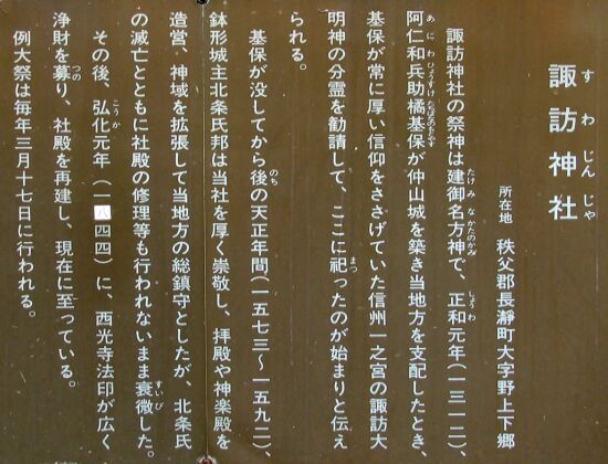 案内には「御祭神は建御名方神で、正和元年(1312)阿仁和兵助橘基保が仲山城を築き当地方を支配した時、基保が厚く崇敬していた信州一之宮の諏訪大明神を分霊勧請して、ここに祀ったのが始まりと伝えられる。天正年間(1573〜1592)鉢形城主・北条氏邨は拝殿、神楽殿を造営、神域を拡張して当地方の総鎮守としたが、北条氏滅亡と共に衰微し、弘化元年(1844)西光寺法印が社殿を再建しました。例大祭は毎年3月17日に行われています。」とあります。