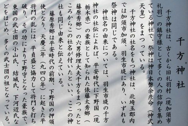 千方神社はこの社と加須市中央と羽生市堤の三社のみのようです。「千方」という社名は佐野唐沢山城主鎮守府将軍・藤原秀郷の六男藤原千方が、父秀郷同様、鎮守府将軍の地位に付きこの地方の徳政を行った功績により、鎮守千方大神として祀られたのが由来と伝わっています。
