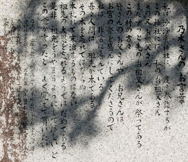 この神社は夫が『乃木希典さんが度々参拝した神社』という事を知っていて今回の旅では欠かせない神社になっていました。此処は全国の宇多源氏・佐佐木源氏(京極家、黒田家、三井家、佐佐木家など二百二十余姓)ゆかりの人たちが信仰する神社で、乃木さんも佐々木四郎高綱の末裔だったようです。雨の中、私達が参拝したときにも他にお一人、佐々木家縁の方でしょうか、本殿から権殿、その他全ての社殿に熱心にお詣りする方がいらっしゃいました。この本殿・権殿その他東西回廊・楼門・拝殿、全て江戸中期に再建されたもので県指定重要文化財となっています。表参道入口の大鳥居を潜り、静まりかえった参道を行くと質実豪壮な楼門が見えてきます。その茅葺きの門を潜り境内に足を踏み入れると、其処には雨に濡れて一段と際だつ社殿の数々が、ただ静かに音もなく建ち並び、清廉な神域という雰囲気を見る者に与えていました。