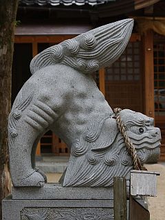 この神社は、出雲市役所斐川支所の南約350mに鎮座しています。神社の前は広々とした駐車場で、入口左に案内板や社号標、中央に鳥居が建立され、右側に大木が聳えています。境内左右で平成生まれの出雲構え獅子が睨みを利かせ、正面奥に出雲では珍しい右綯いの注連縄が架かる、唐破風付き入母屋造りの拝殿・本殿が建立されています。境内周囲には豊栄神社等の境内社が祀られ、狛犬の先代さんもきちんと取ってあり、とても嬉しく拝見しました。
