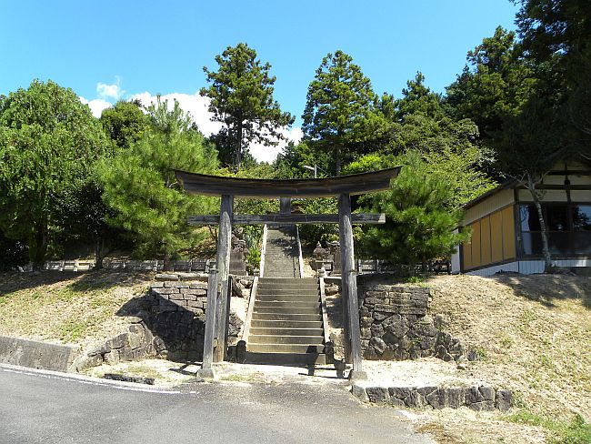 入口には両部鳥居が建立され、十数段の石段を上がると神楽殿の建立されている下の境内。更に石段を上がると拝殿・本殿が建立されている上の境内が有ります。又、社殿左には境内社が二社祀られ、奥には石碑が二基。周囲は畑でのどかな雰囲気でした。