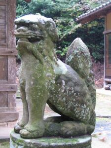 | 入り口鳥居後ろの阿吽が反対位置の出雲構え獅子。 来待石で作られた狛犬としては110年も経つのに、綺麗に保たれています。 |