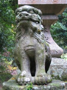 | 小振りで阿吽が反対位置の出雲構え獅子。 舌や歯並びがよく見えるせいか扁平なゲジゲジ眉毛のせいか ヤンチャ坊主が飛び出してきそうな感じです。 |