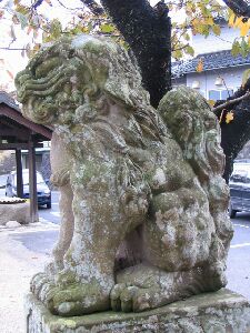 | 参道石段下に居る出雲構え獅子。明治10年9月建立。 細部が壊れかけています。 |