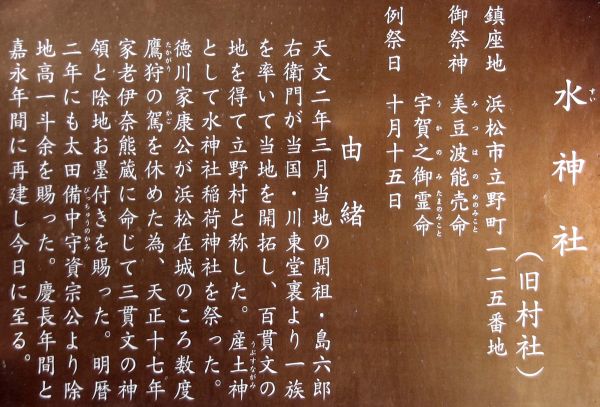由緒:旧村社で、天文2年(1533)当地の開祖・島六郎右衛が一族を率いて当地を開拓し、産土神として水神社稲荷神社を祀りました。
