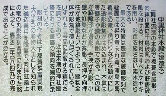 この神社は、寒川小のすぐ近くにあります。地図には「明神神社」と載っていますが、神社入口の説明板には中里神社とあります。狛犬は、昭和16年でした。本殿の彫刻は、説明板の通り素晴らしいものでした。