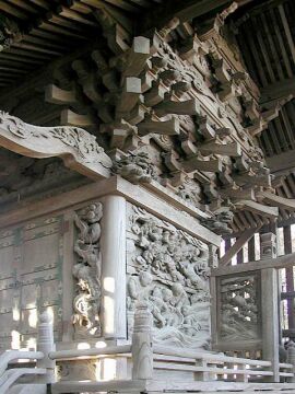 市の有形文化財に指定されている本殿は、嘉永2年(1849)磯辺義兵衛隆信の作で、一間社流れ創りで板葺き屋根、彩色を施さない素木造りで、材料はすべてケヤキ材、向拝正面に千鳥破風および軒唐破風を設けています。壁面には昇り龍・下り龍をはじめ浦島太郎・養老の滝・魚採りなどをモチ−フとした透かし彫り彫刻がはめ込まれ、木鼻は狛犬や獏が用いられています。