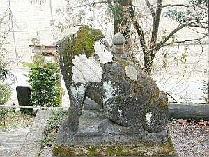 | 階段上の江戸狛犬。 眉毛が目にかかって老人っぽい狛犬ですが、優しげで風格が溢れています。 丁寧な彫りで、尻尾の大きな渦が左右に分かれているのが面白い工夫です。 |