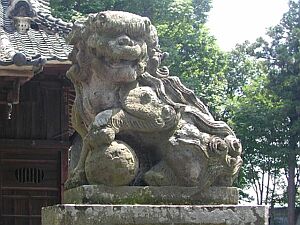 | 寛政7年(1795)生まれの狛犬。 石が脆いのか、台座から落ちて損傷したのか、酷い欠け方と剥落の仕方ですが、 在りし日を想像すると、佐野市岩崎町・八幡宮(年代不明)の狛犬とよく似ている様に思います。 |