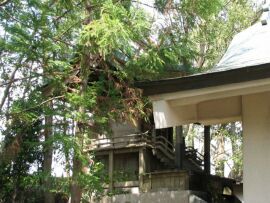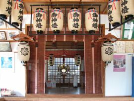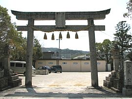 この神社は桑野川が岡川と合流する手前の右岸、富岡新橋北東に鎮座しています。入口正面には氏子地域6町の神輿倉を思われる建物が整然と並んでおり、境内は周囲には木々が植えられさわやかですが、広い中央部分は明るく祭礼時にはさぞや賑やかに人々が集うのであろう事を伺わせています。