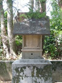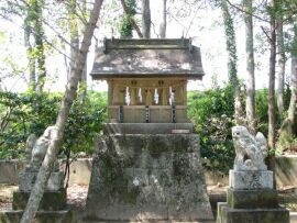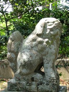 弘化3年(1846)生まれ、吽には角があり、姿勢の綺麗な狛犬です。 阿は歯茎まで出して威嚇をしているようですが、実際には丸い可愛い目つきや 潰れ気味の顔で、とても愛嬌のある狛犬です。 狛犬の拡大写真はこちらで |