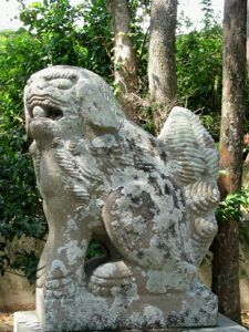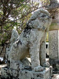 文政4年(1821)生まれの、ギリシャ神話のポセイドンを思わせる髭面の狛犬です。 吽には角があり、まん丸目で穏やかな風貌をしていて 、垂直に伸ばした長い前脚を踏ん張って、シャキッと背筋を伸ばしています。 狛犬の拡大写真はこちらで |