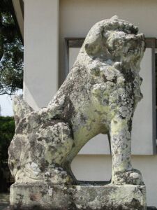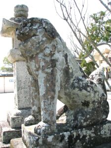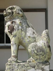 昭和7年生まれのコロコロした狛犬です。 長い耳垂れで横長のアーモンドアイ、団子っ鼻がご愛敬。 狛犬の拡大写真はこちらで |