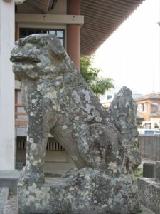 | 年代不明の狛犬。眼には瞳が線書きで表現されています。 背筋が伸びた姿や真っ直ぐにすっくと伸ばした直線的な前脚から、若々しさが感じ取れます。 すきっ歯が面白いですね。 |