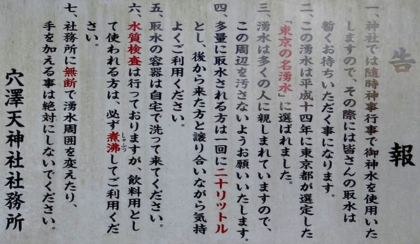 市内最古の神社。8月下旬に行われ例大祭では、「江戸の里神楽(国指定民俗文化財)」や「獅子舞(市指定文化財)」が奉納されます。神社下の湧水は「東京都名湧水57選」に選ばれており、御神水として親しまれ、水を汲みに来る人が絶えません。訪れた日にも水を汲みに来た人がいました。