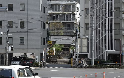 神社全景。都内の神社です。境内が有料駐車場となっています。