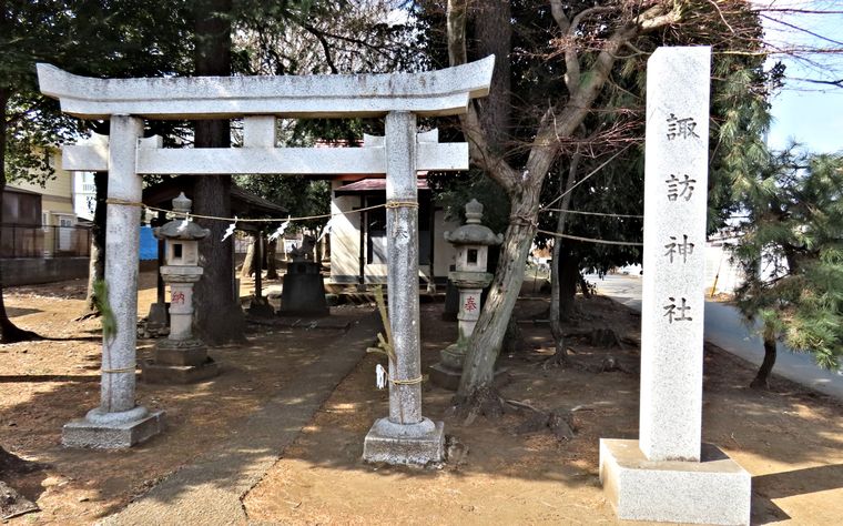 宮沢新田の鎮守。新田開発の際、親村の現昭島市宮沢の諏訪神社のご分霊を遷した。古くから宮沢新田の鎮守として祀られているが各種史料に記載がなく、明治になっても格式が与えられず正式には神社とされなかった。境内には眼病に霊験あらたかという小祠がある。