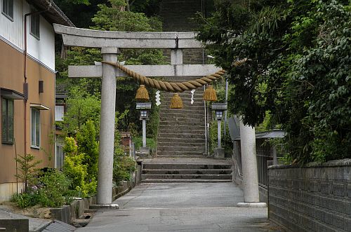 道路脇に社号標が建ち、参道途中に「布勢の円山」の案内があります。台輪鳥居を潜るとすぐに山上に続く石段参道があり、直登が厳しい人のために左側には緩やかな回り道も造られています。
