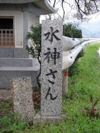 由緒書きには、「明治22年8月10日の台風により、田辺地区には20時間で9000ミリ以上の記録的な豪雨が降り、津殿の堤防が決壊し、この地周辺を洪水が襲いました。この地の良田も一面河原同様の有様で、南部川筋の流失倒壊家屋損壊は甚だしく、死者も多数出ましたが、川に流された死体はこの付近に流れ着き、地区民は水死者の慰霊と堤防の安全を祈願し、この地に「水神さん」を祀りました。楡の大木は当時の流木が生え付き成長したものと云われています。」と書かれています。