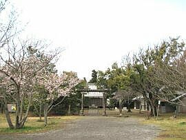 | 神社遠景。参道は桜並木です。 | 境内入り口 |