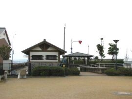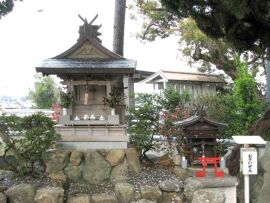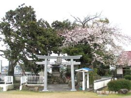 この神社は会津川の左岸河口近くの錦水公園内に鎮座しています。この公園は、明治初年まで紀州藩付家老安藤氏の居城であった田辺城、別名錦水城の水門跡が残されている場所で、もしかしたらこの神社は安藤氏の屋敷神だったのかもしれません。