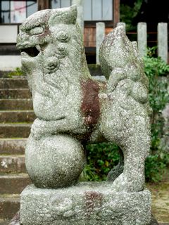 拝殿前の玉乗り狛犬。拡大写真はこちら。