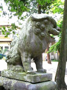 この神社は県道22号線の笛吹川に架かった蛍見橋を甲府市方面に向かい、小石和の交差点を右折、150mで5差路に突き当たるので右から2番目の道を行くと200m位で神社の正面に行き着きます。此処は社地の右側には超立派な公民館が建ち駐車場となっており、左半分に木々が生い茂り参道が続いています。入り口直ぐには立石が置いてあり、注連柱、両部鳥居と続き、その奥に又立石、随神門が有ります。門を潜り境内に足を踏み入れるとまたまた背の高い立石、灯篭、狛犬がおり、その後ろにやっと拝殿。参拝を済ませ拝殿内を良く見ると奥のガラス越しに何か見えます。どうも木製の神殿狛犬らしいのですが遠いしガラスの反射でよく見えません。裏に廻っても覆われていてどうしようもないので、又正面に戻り駄目元で写してみました。何とか居るのだけは分かりますが、そういう事情ですのでご容赦を・・。