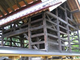 この神社は県道6号線が塩川に架かる塩川橋西詰から北に向かい中央本線を潜り尚も400m程北に行くと左手に鎮座しています。広々とした境内に変わった神門、開放的な拝殿、傷んではいるけれど柿葺きの本殿が建っている明るい感じの神社でした。