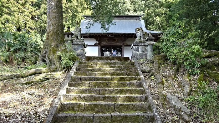 ここは狛犬ファンなら殆どの人が知っている、最古の国産石造り狛犬?が居る神社です。県道29号線から県道36号線を結ぶ金川曽根広域農道の中間辺りに陸橋が架かっているので、その直ぐ手前を右折すると、右の杉林の中に赤い社殿が見えます。注意深い人は此処で本殿前に檻に閉じ込められた狛犬が居る事に気がつく筈です。応永12年(1405)2月1日という銘が腹部に入っているそうですが、所謂『はじめちゃん』より300年近く以前に造られた物とはとても思えないほど、デザインも斬新で洗練されていますし、磨耗も損傷も少ないように思いました。神社そのものも、緑の中に静かで落ち着いた雰囲気の、まったりとした心安らかな時間をたっぷりと持てる・・・そんな感じのする神社でした。